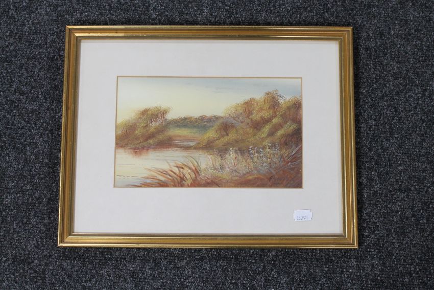 A gilt framed S. Moore watercolour depicting a lake