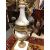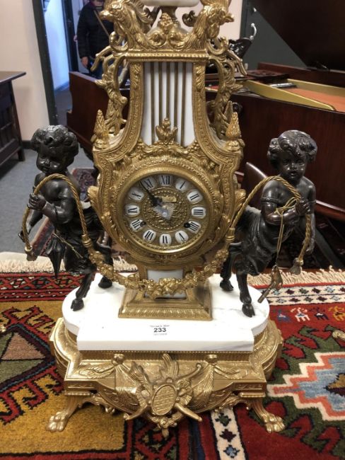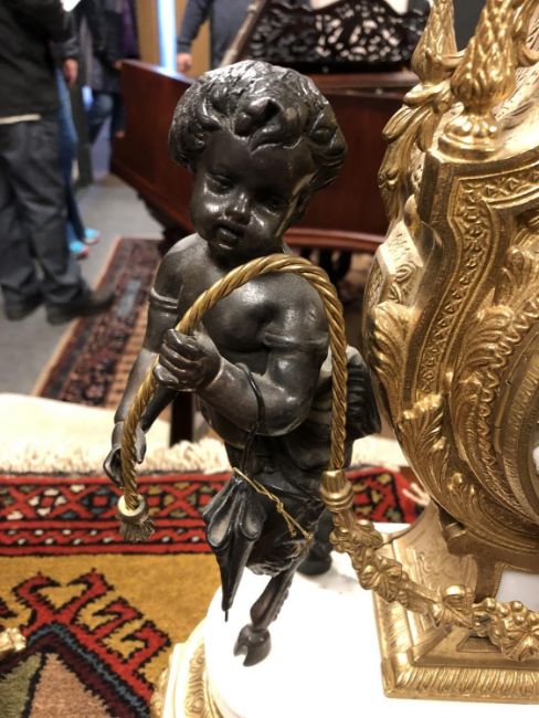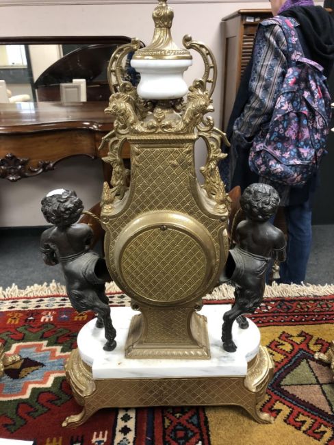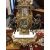 This is a late 20th century continental piece. It is made of marble, gilt brass and spelter. The clock is 60cm high and the candelabra are 69cm high.