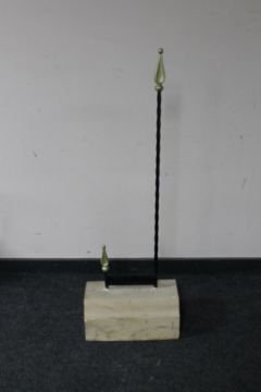 A wrought iron boot scraper mounted on a sandstone brick
