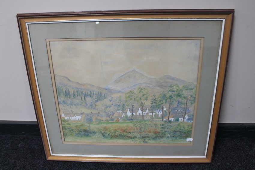 A framed watercolour depicting rural village scene