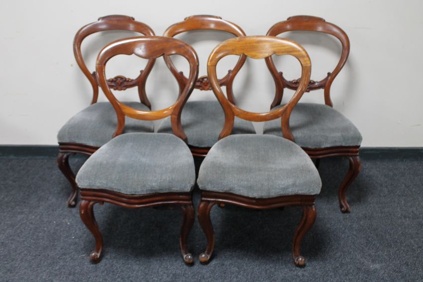 Three Victorian mahogany balloon back chairs and a further pair of chairs (5)