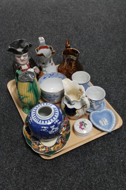A tray of antique and later china : copper lustre jug, ironstone jug, antique Toby jug (restored), ginger jar, etc