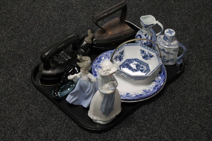 A tray of two Nao figures, Poole dolphin, Delft jug, Chinese style teapot, blue and white dish, two wall plates and two flat irons