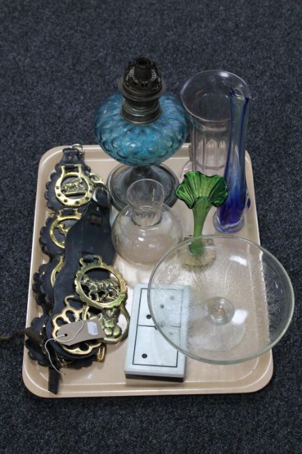 A tray of antique oil lamp with blue glass reservoir, glass vases, boxed domino's, horse brasses etc