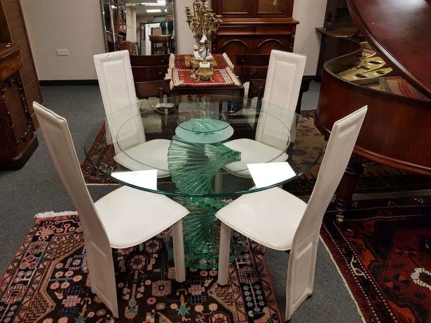 A circa 1970's Italian all-glass dining table on twist column support, with glass lazy Susan and a set of four high backed chairs
