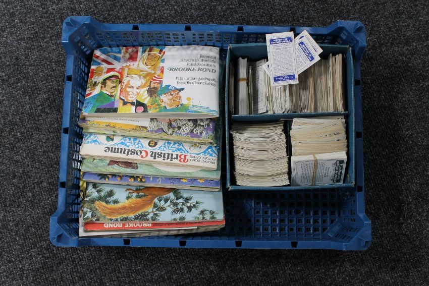 A box of Brook Bond tea card albums, box of tea and cigarette cards