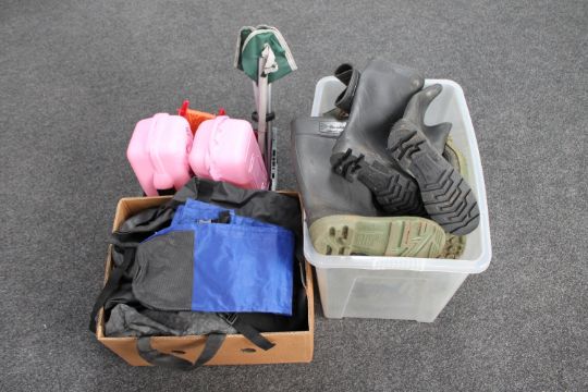 Two crates and a box of Wellingtons, fishing bags, tackle box, fishing seat, etc