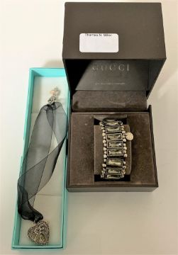 A Philippe Audibert expanding bracelet and a silver and marcasite heart locket