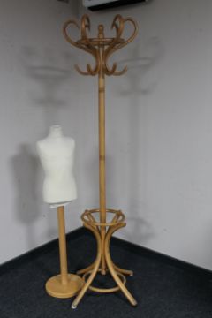 A Bentwood hat and coat stand and a child's mannequin on pine base