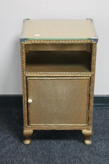 A gold rusty Lloyd Loom glass topped bedside cabinet