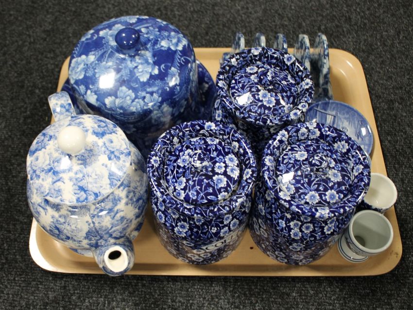 A tray of blue and white ware : three Calico Burleigh storage jars, Arthur Wood teapot, ironstone cheese dish and cover etc