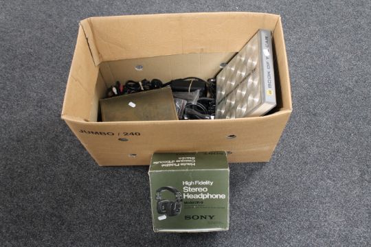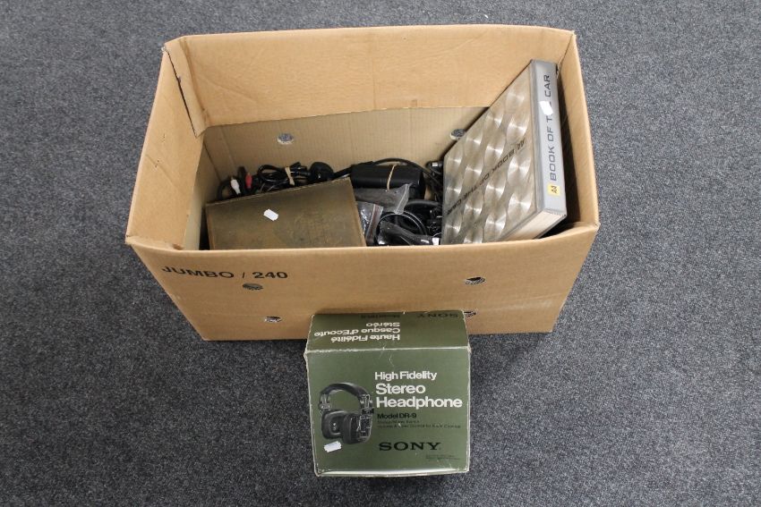 A box of Sony high fidelity headphones, electrical cables, AA book of the car etc