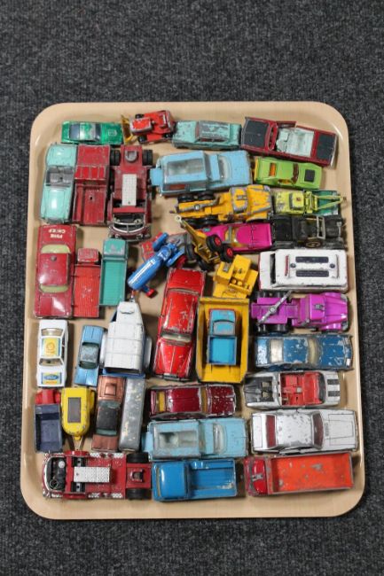 A tray containing mid 20th century and later die cast cars including Corgi, Matchbox etc