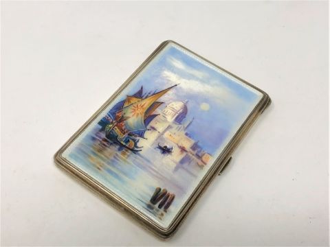 A silver and enamel cigarette case depicting the Venice lagoon.