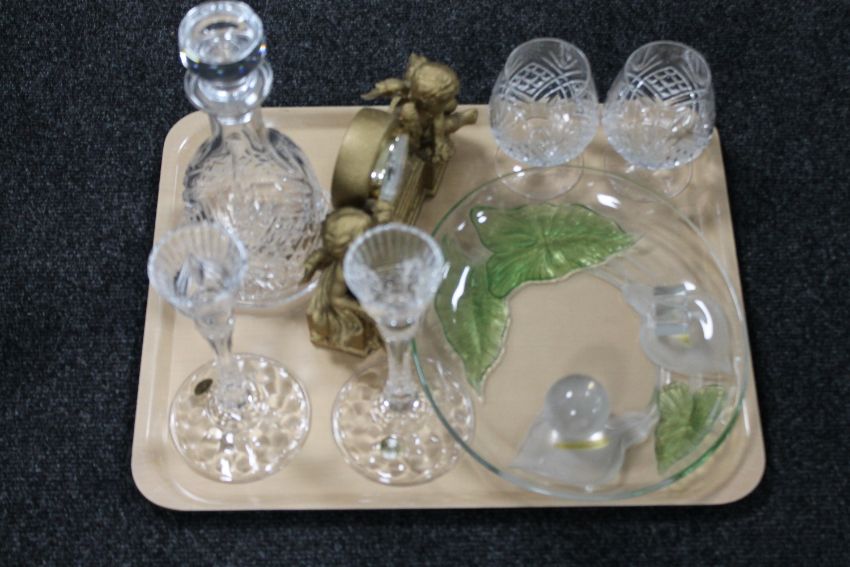 A tray of cherub mantel clock, lead crystal decanter, pair of RCR crystal candlesticks, glass dish etc
