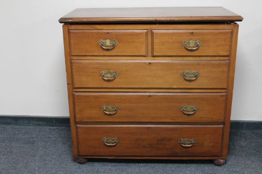 A mahogany five drawer chest of bun feet (one missing)