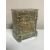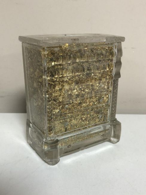 A miniature glass lidded chest of drawers filled with gold leaf, height 11.5cm