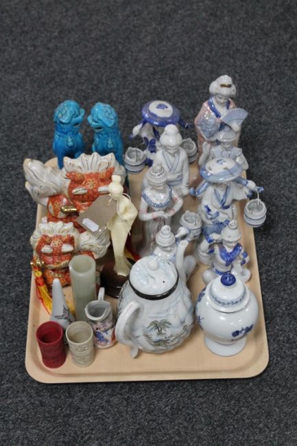 A tray of oriental china to include figures, blue and white ginger jar etc