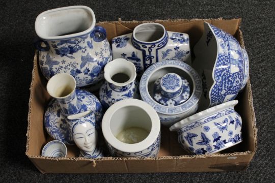 A box of Chinese blue and white glazed pottery to include planters, fruit bowls, vases, wall pocket etc