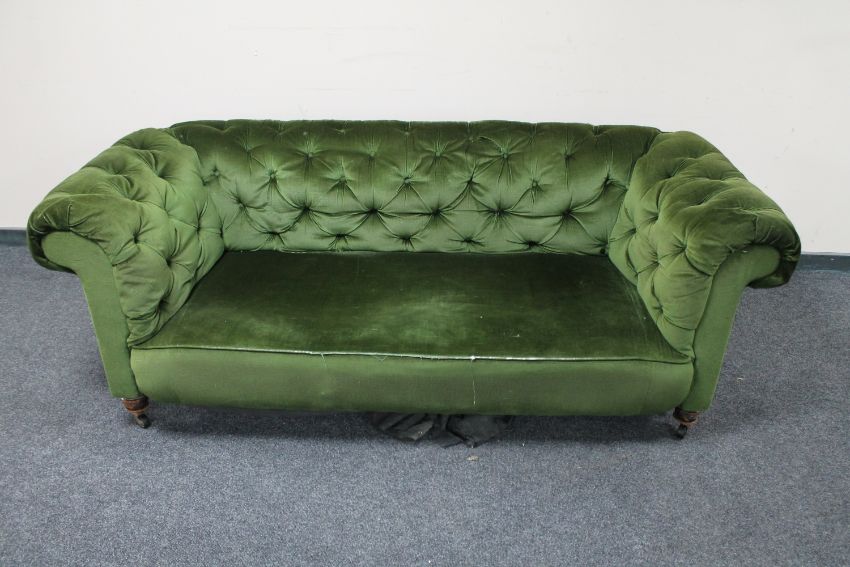An antique Chesterfield style settee upholstered in green buttoned dralon