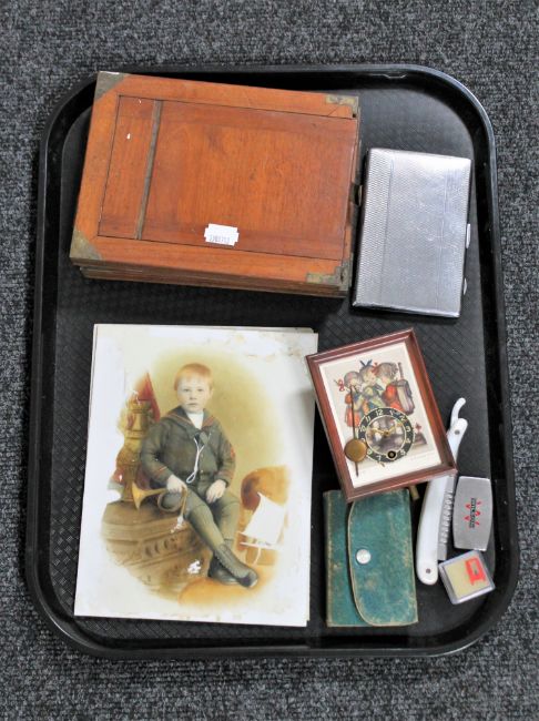 A tray of two Victorian portraits on glass, antique camera plates, Hummel miniature wall clock, cut throat razor, leather cased miniature silver and enamelled comb set etc