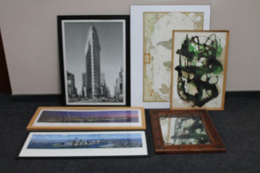 A hardwood framed mirror together with three framed prints depicting New York and two further framed prints