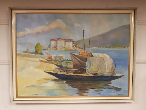 A continental oil on canvas - fishing boats on a beach, 113 cm x 83 cm, framed.