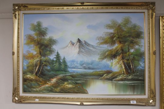 ** Withdrawn ** A late 20th century gilt framed oil on canvas, lake in woodland with mountains beyond, indistinctly signed
