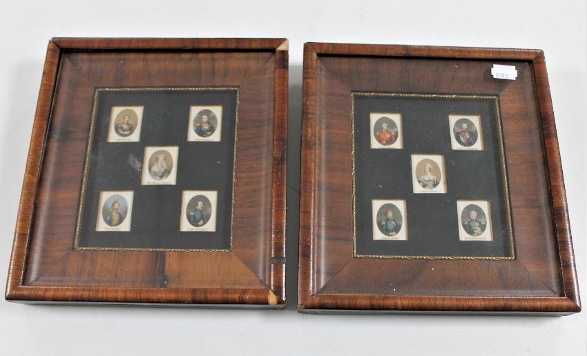 A pair of Victorian rosewood frames containing portrait miniatures of the Allied sovereigns and their commanders of their forces