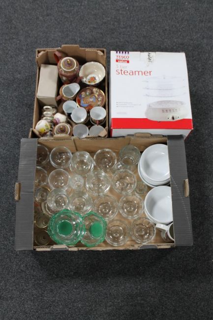 A boxed three tier food steamer together with two further boxes of glass ware, Japanese coffee service, cereal bowls etc