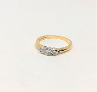 An 18ct gold three stone diamond ring, the stated total diamond weight 0.43 carat, size Q