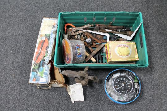 A crate of hand tools, vintage blow lamp, motorbike speedometer, Black & Decker safe and tidy cable