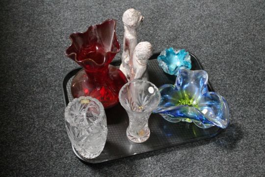 A tray of two studio pottery figures, crystal vases, Bohemian glass ware
