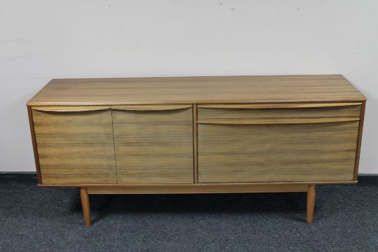 A six piece mid twentieth century teak dining room suite comprising of low cocktail sideboard, drop leaf table and four chairs