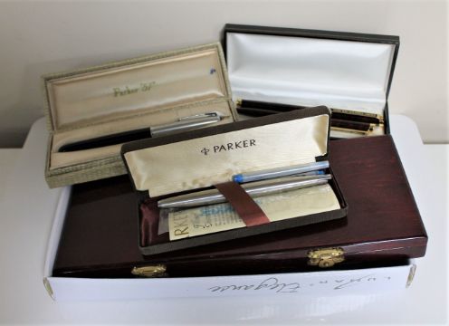 A box of containing a set of twelve Chinese Zodiac coins, Harmonica, cased Parker pens etc