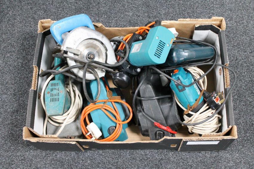 A box of a quantity of assorted power tools including Black and Decker jigsaw, router and sander