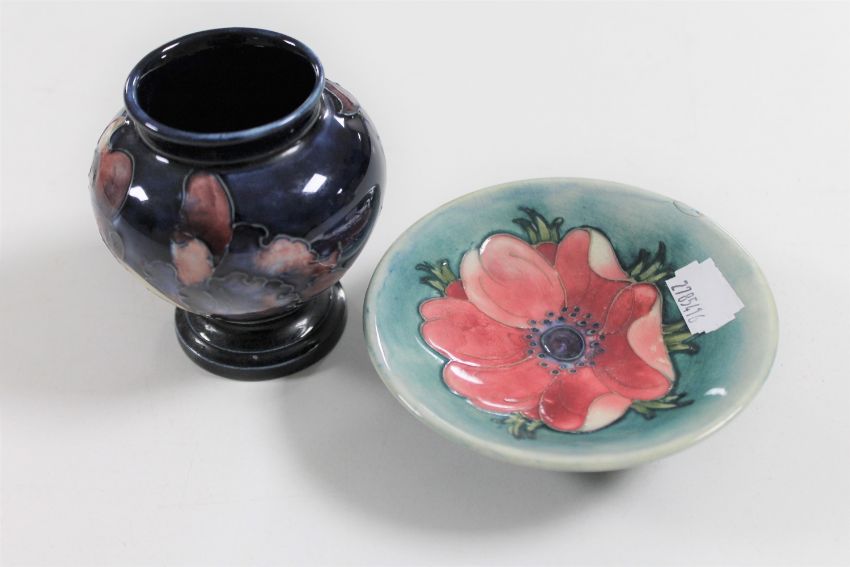 A Moorcroft shallow dish, anemone flower and a further Moorcroft squat bulbous vase