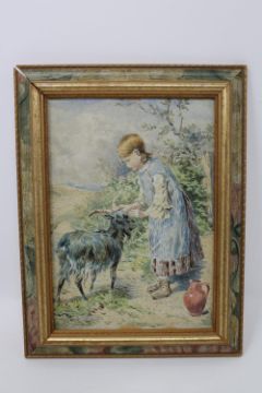 Manner of Myles Birket Foster RWS (1825-1899), Girl with billy goat, watercolour laid to board, bears monogram, 18cm by 13cm