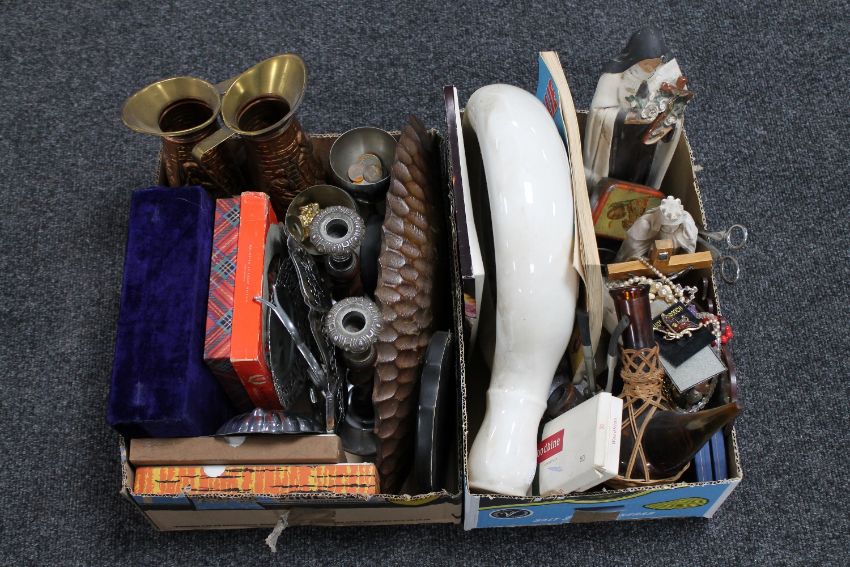 Two boxes of, religious figures, pipes, plated ware, copper and brass jugs etc
