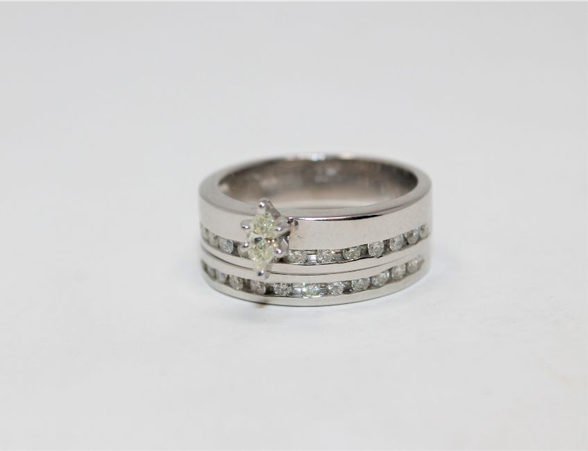 A 14ct white gold marquise and brilliant-cut diamond half-eternity ring, together with a matching half eternity ring, size N.