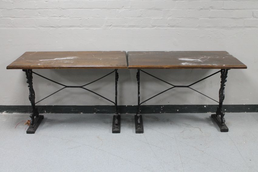 A pair of rectangular bar tables on cast iron legs