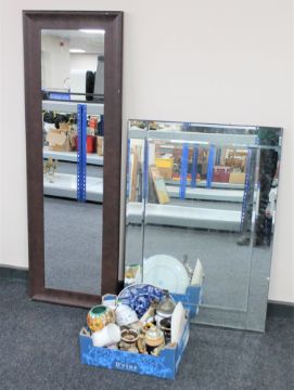 A box of assorted china : mugs, beer steins, wall plates, hall mirror and all glass mirror