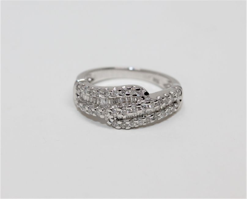 An 18ct white gold diamond set ring, set with brilliant and baguette-cut stones, size L.