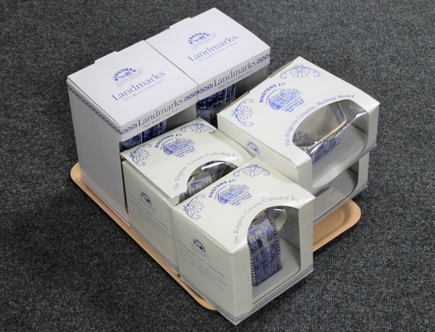 A tray of Ringtons china : two vases, two boxed cathedral jug, two boxed cathedral and castle bowls