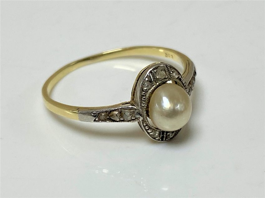 Accompanying the ring is a photograph of the purchase invoice from Antique Velvet Gloves. This states the pearl to be a natural saltwater pearl, measuring approximately 5.1mm by 5.5mm. The total diamond weight is declared as 0.23 carat. Weight 1.6g.