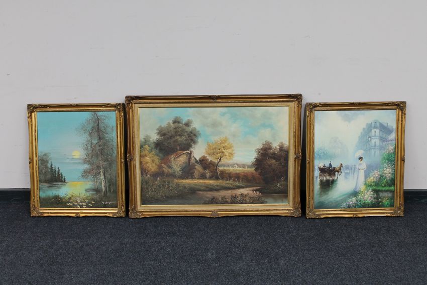 A Ron Brenson gilt framed oil on board, Edwardian street scene, together with two other gilt framed oils and board depicting a lake scene and a rural homestead (3)