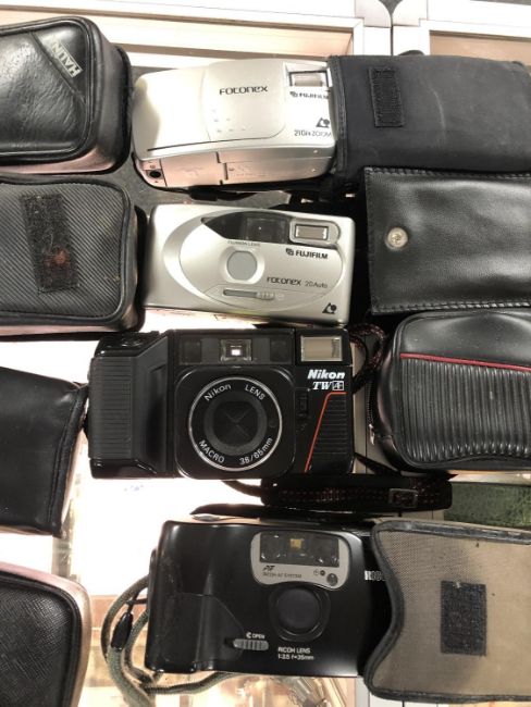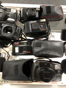 A box of assorted cameras : Canon, Pentax, Haminex, etc