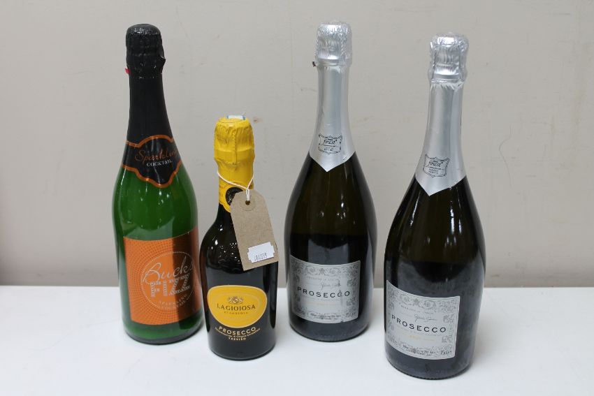 Three bottles of prosecco and a bottle of bucks fizz