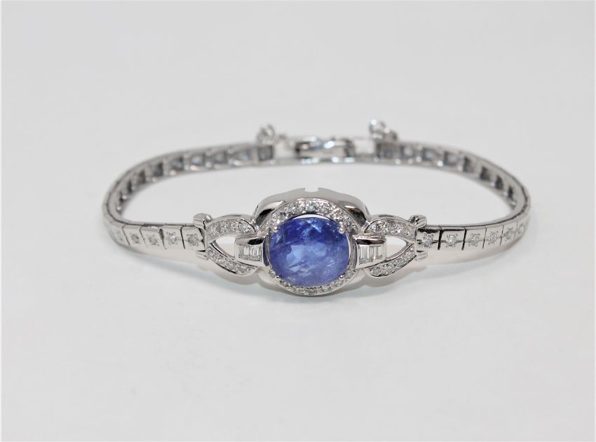A 14ct white gold tanzanite and diamond Art Deco style bracelet, the cushion-cut tanzanite weighing 5.05 carat, the total diamond weight 0.66 carat. With certification.