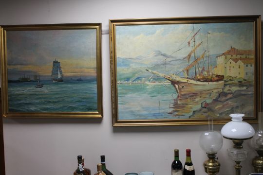 Two continental school gilt framed oils on canvas depicting sailing ships